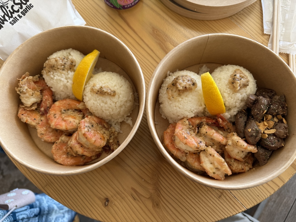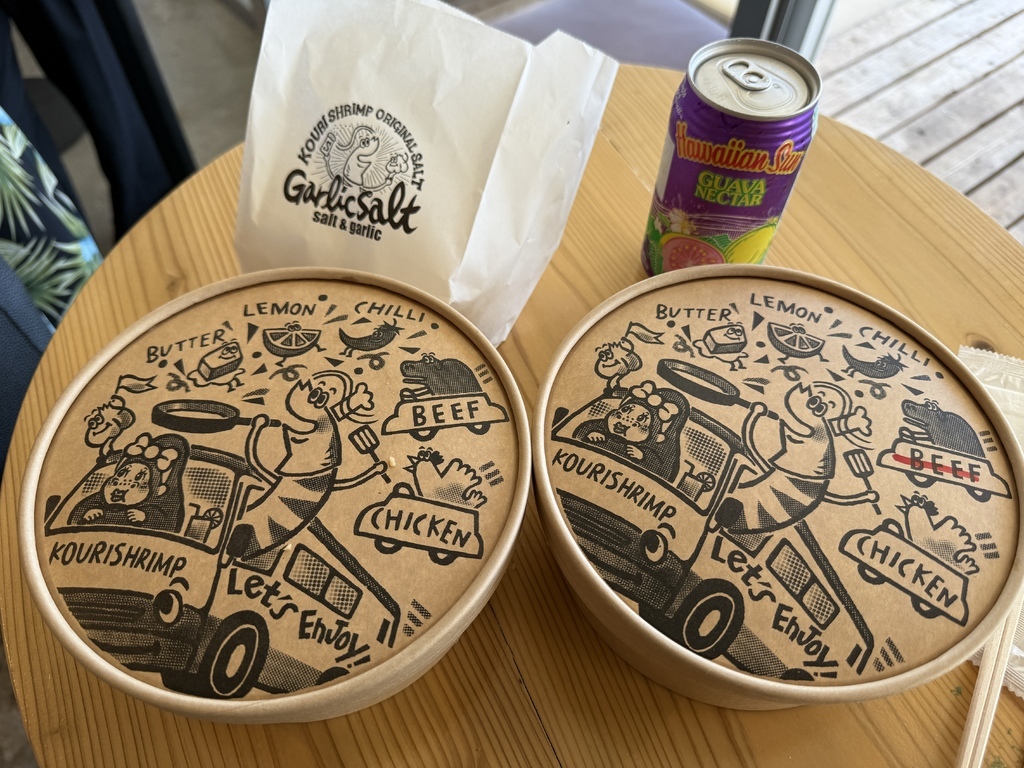 ▲接著我們前往期待已久的蝦蝦飯,從美麗海水族館出發,大約18公里的車程。一路上,老婆掌握方向盤,而我則悠閒地欣賞窗外沖繩的絕美海景。經過壯觀的古宇利大橋,蔚藍的海水與潔白的橋身交織成一幅令人驚嘆的畫面,不禁讓人心情大好。終於抵達這間知名的蝦蝦飯,果然人氣非凡,店內座無虛席。我們很幸運地在營業結束前點到了心心念念的餐點。蒜香與酸味完美融合,每一隻蝦子都鮮甜多汁,搭配肉塊與白飯,簡單卻令人回味無窮。難怪這家店能成為人氣打卡熱點。雖然店內擁擠,垃圾桶也稍顯滿溢,但這絲毫不影響用餐氛圍。邊吃邊欣賞窗外的古宇利大橋,那份美景和美食交織的享受,真的是一次完美的沖繩體驗。還有,日本的白飯到底有什麼魔力,竟能這麼好吃!