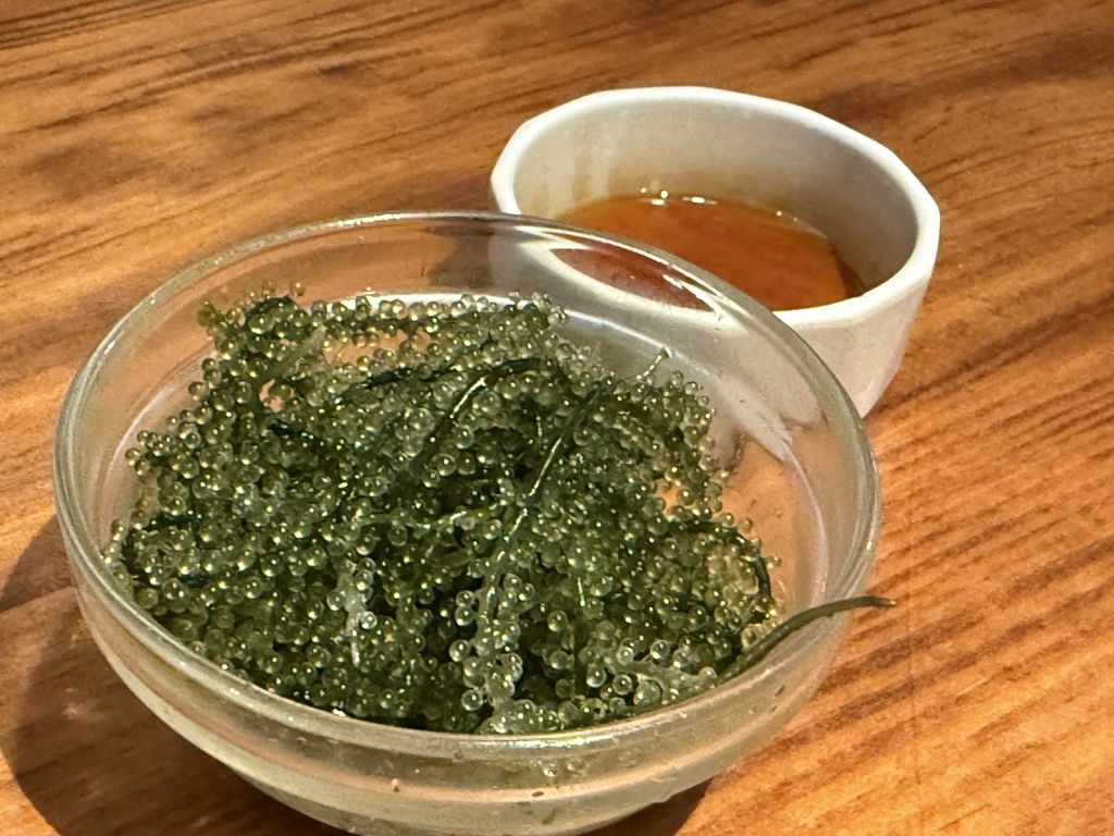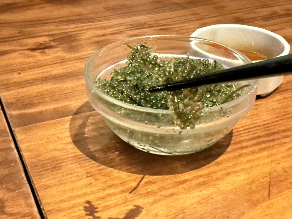 ▲海葡萄,沖繩限定的綠寶石,這頓飯的開場白就由傳說中的「海葡萄」揭開序幕。身為第一次來沖繩的觀光客,當然要點一盤來嚐鮮。翠綠剔透的海葡萄端上桌,一顆顆晶瑩如魚子醬,入口瞬間在舌尖上「啵啵」爆開,鹹香海味立刻瀰漫整個口腔,那是一種介於海水與昆布之間的滋味。沒有腥味,反而讓人忍不住一口接一口,難怪友人早早就推薦:「一定要試試!」這道來自海洋的天然小食,果然沒有讓人失望。