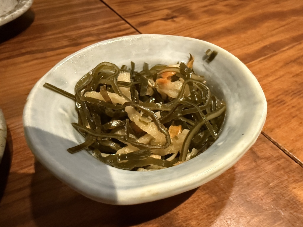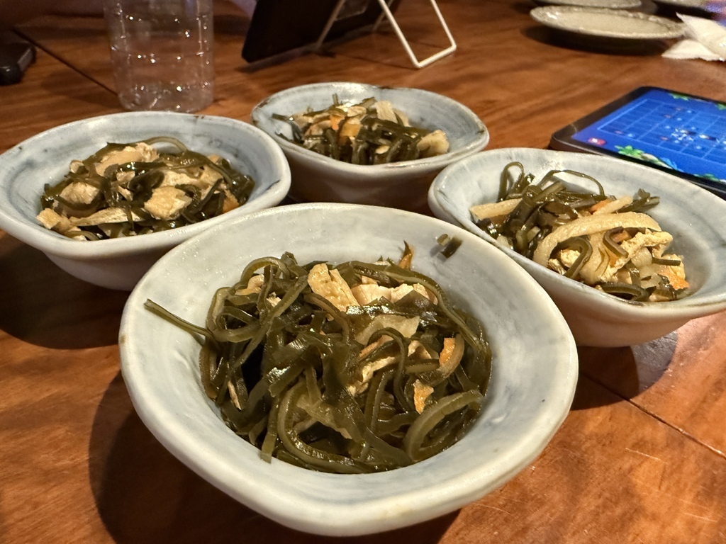 ▲海帶小菜,走在熱鬧的國際通上,一行人還在猶豫晚餐要吃什麼。就在經過「波照間 沖繩地方料理 國際通店」的時候,不約而同地停下腳步,彼此對看一眼:「欸,那就吃這家好了!」就這麼隨性地走進店裡,沒想到竟是一場味蕾驚喜。店內熱鬧得很,從店內傳來的吆喝聲、客人們此起彼落的笑語,讓整個空間充滿人情味。最特別的是,我們被帶到塌塌米座席,席地而坐的用餐方式,對習慣餐桌椅的台灣人來說多了點異國感,這就是旅行中最迷人的體驗之一。