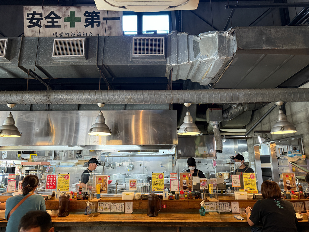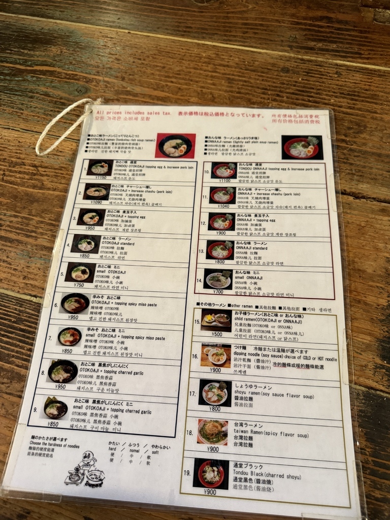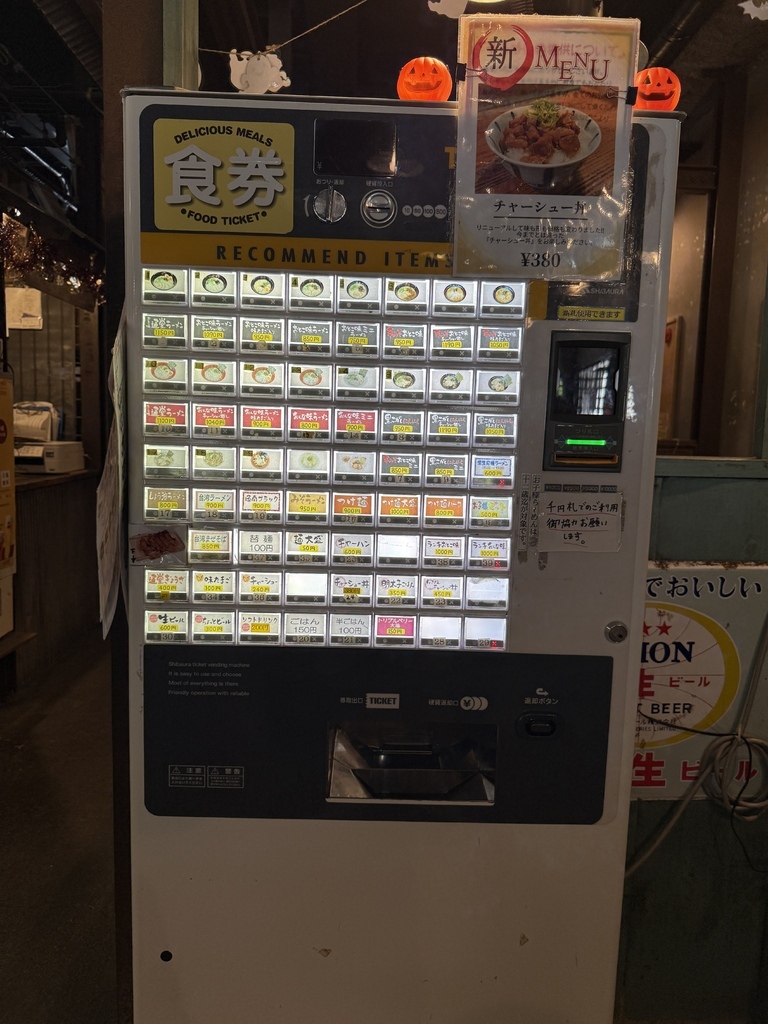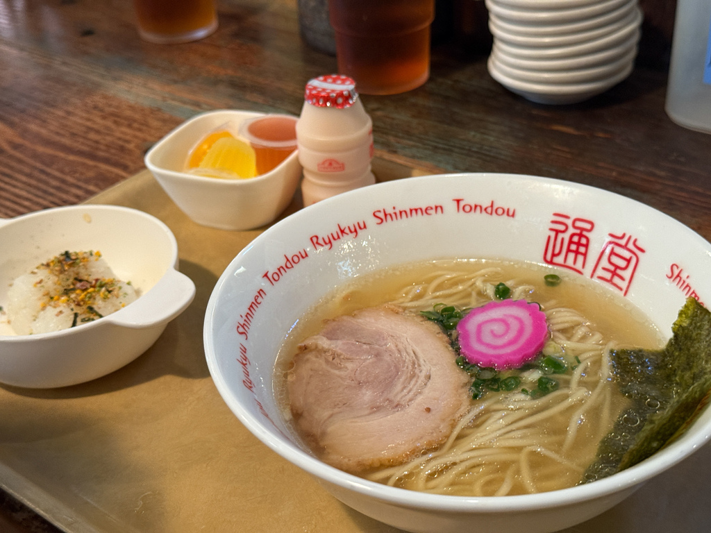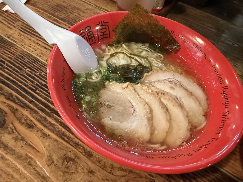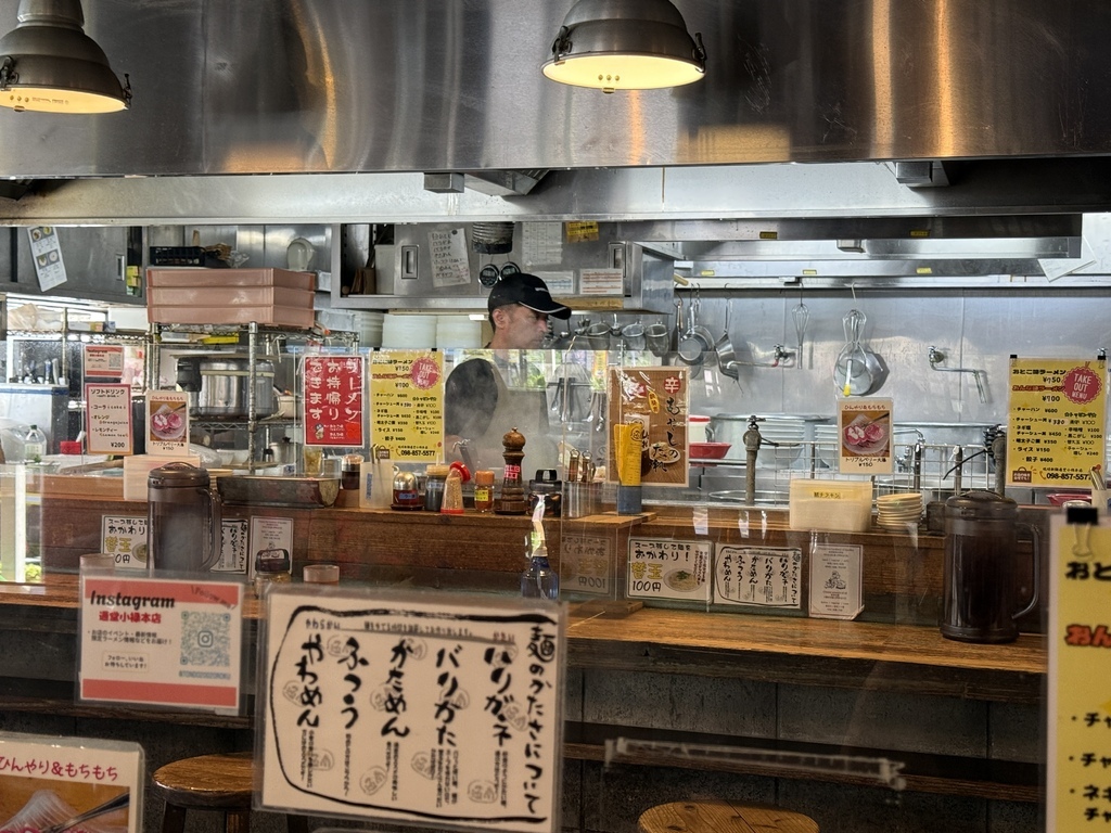 ▲結束波上宮的行程後,順路來到通堂拉麵小祿本店。這家店位置相當方便,地下就是停車場,對自駕旅人非常友善。也許是我們到得早,店裡還不算擁擠,但吃完出來時,門口已經大排長龍,果然是人氣名店。店內保留了老屋風格,木質裝潢配上昏黃燈光,氛圍溫暖樸實。點餐方式先參考圖文菜單,再到自動售票機購票,操作簡單也增添一點旅行中的新鮮感。
