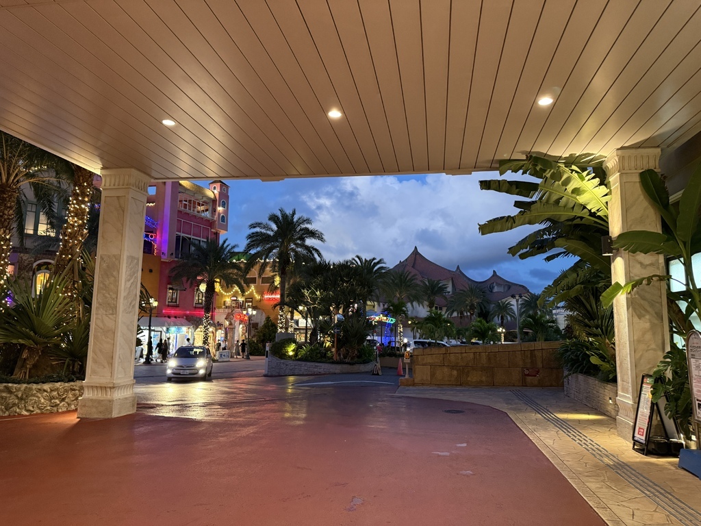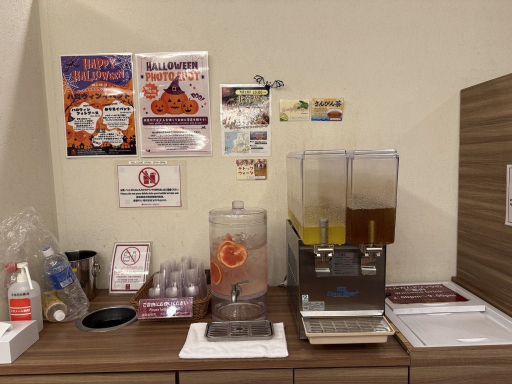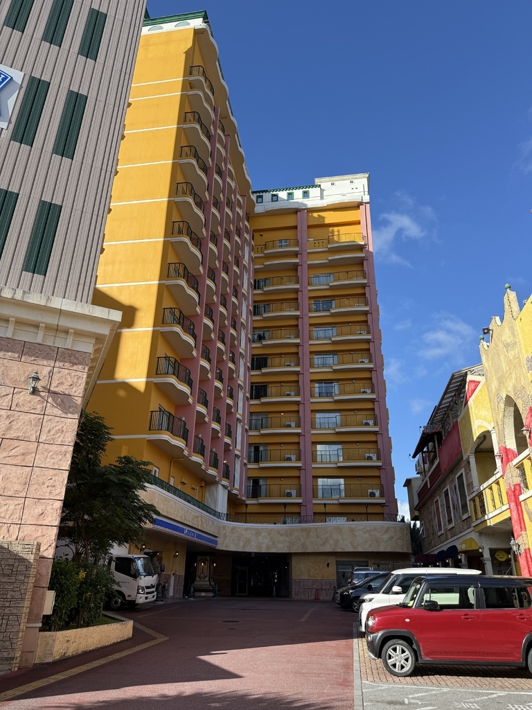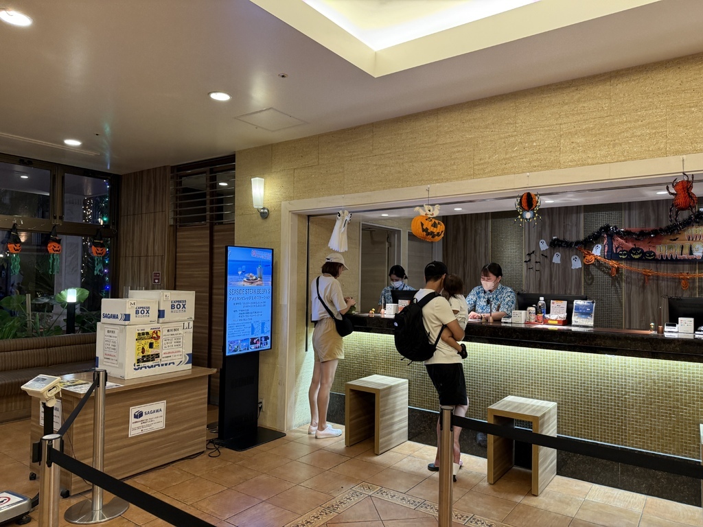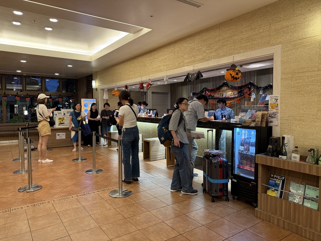 ▲結束玉泉洞行程後,我們直接驅車前往 Vessel花苑沖繩。這間飯店位置超便利,樓下就是熱鬧的美國村,停好車後幾乎不需要再移動。抵達時還小挑戰了一下飯店的立體停車塔,順利完成停車後便到櫃檯辦理入住。大廳相當貼心,提供無限量飲料與冰棒,讓旅人隨時都能補充清涼能量。