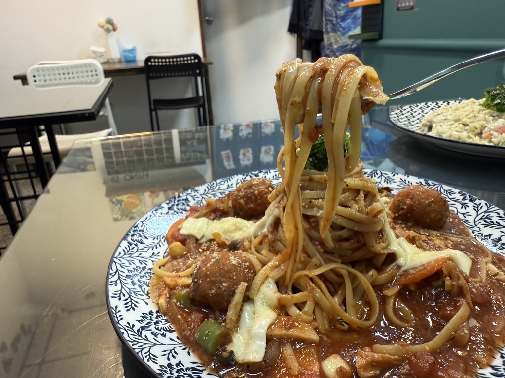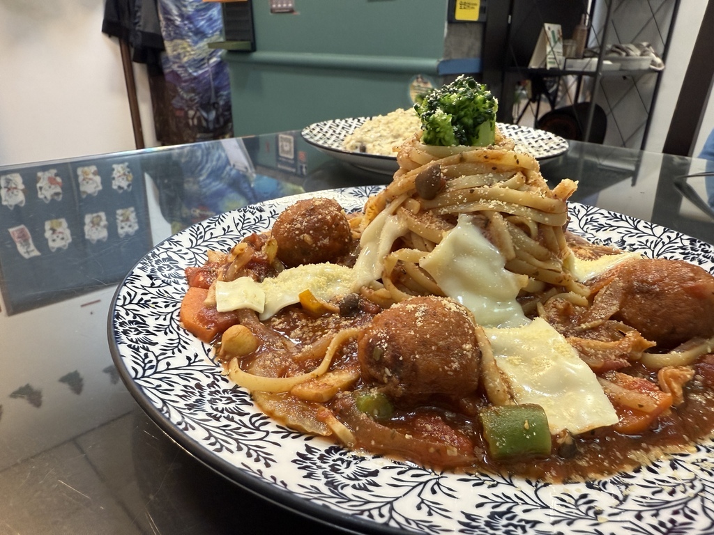 ▲起司獅子丸細扁麵($180),起司獅子丸細扁麵是一道讓人驚喜的蔬食主餐,獅子丸吃起來有點像 IKEA 的素肉丸,外層微酥、內餡紮實,充滿香料氣息。麵條份量十足,是那種會讓你吃到撐的份量,加了起司後味道更濃郁,融合酸酸的紅醬,開胃又不膩口。整體調味層次分明,是一道不只視覺吸引、味覺也相當滿足的餐點。