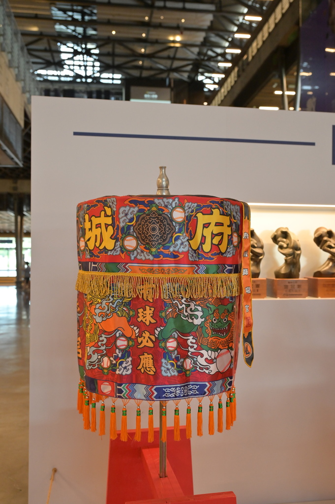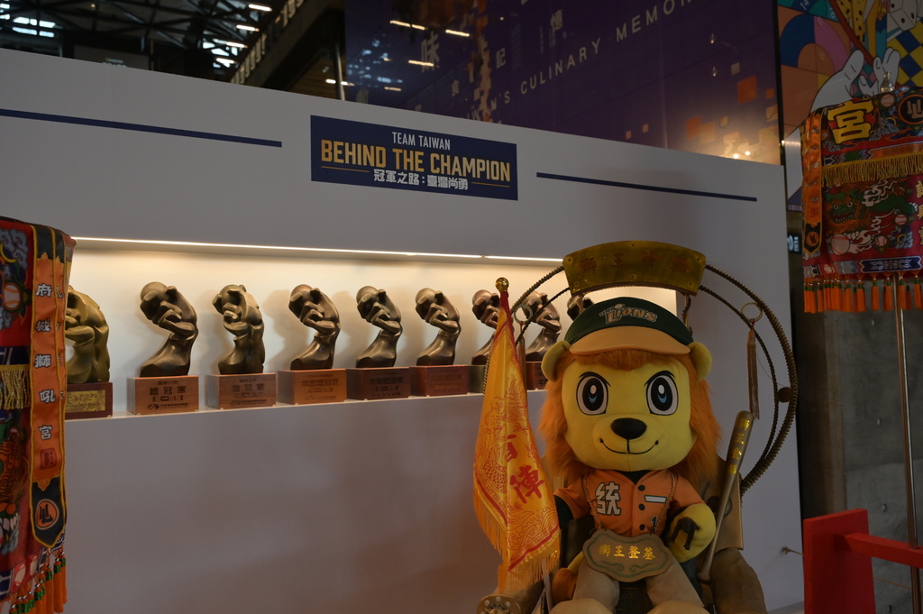 ▲除了國家隊的榮耀,展覽也特別納入統一7-ELEVEn獅隊的精彩歷程,首次完整展出十座年度總冠軍獎盃,並結合台南信仰文化打造出「獅王神轎」,由吉祥物萊恩乘坐,象徵稱霸球場的霸氣與傳奇。