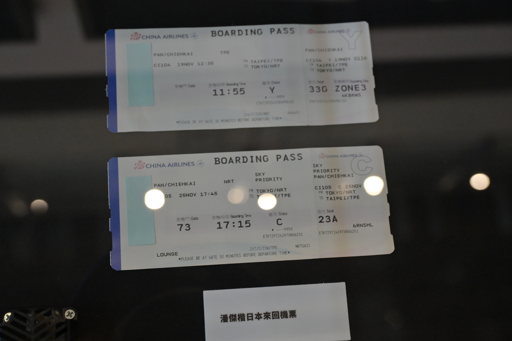 ▲往東京的機票以及陳傑憲、潘傑楷、郭俊麟的球衣。